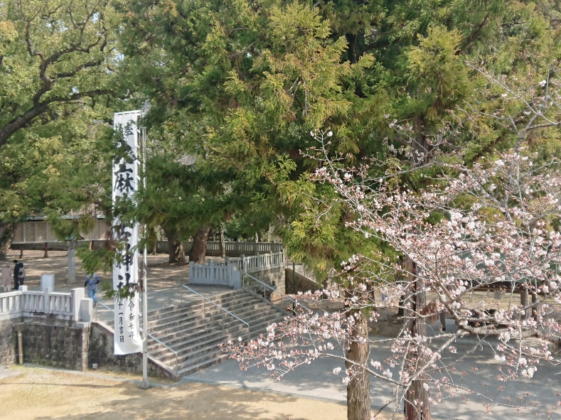 早朝7時 いつものように大麻比古神社参集殿のお支度部屋から見える風景。 目の前に淡く控え目な白い桜が飛び込んできました。桜色とは、赤みを含んだ淡い紅色のこと。紅染めの最も淡い色。 「桜色に衣は深く染めて着む 花の散りなむ後の形見に」という和歌がありますが、平安時代の頃、桜とは山桜のこと。桜の7~8割が同じ遺伝子を持つことから、ほぼ同じ時期に咲くのだといわれています。